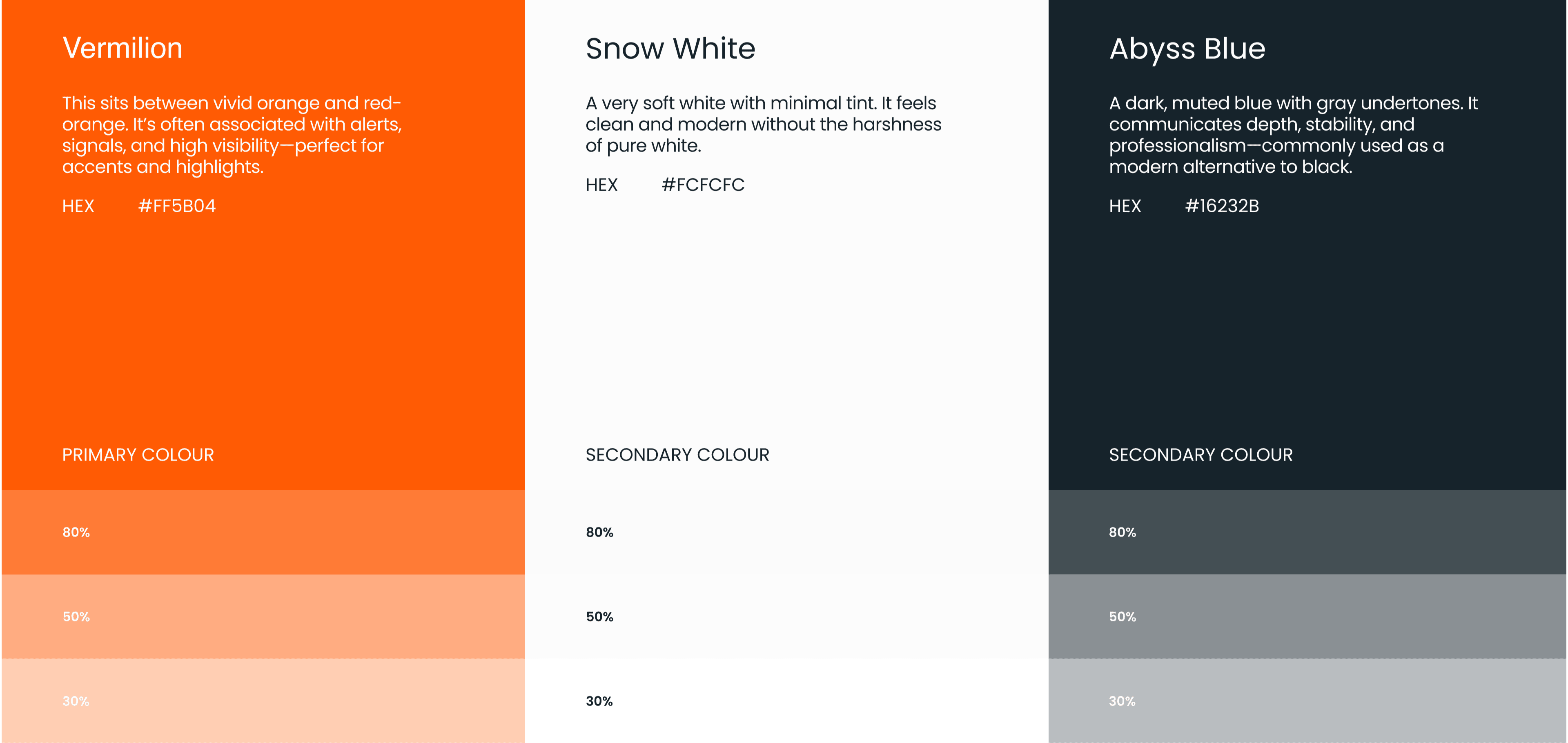 The dark and light neutrals provide flexibility across interfaces, ensuring readability in both data-dense dashboards and simple brand moments. The accent color introduces energy and direction to the design.