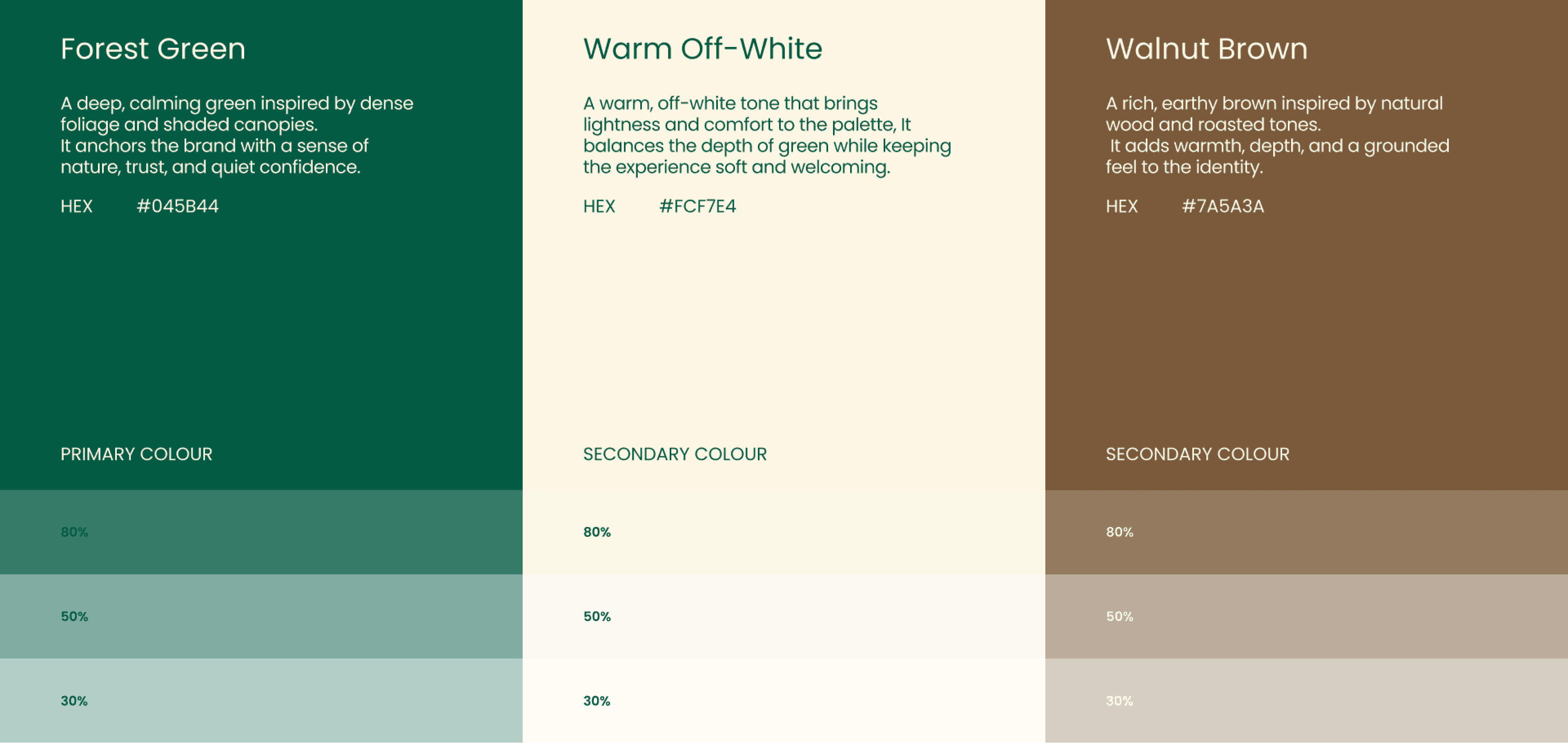 Forest Green – The core brand color, representing growth, calm, sustainability, and trust.