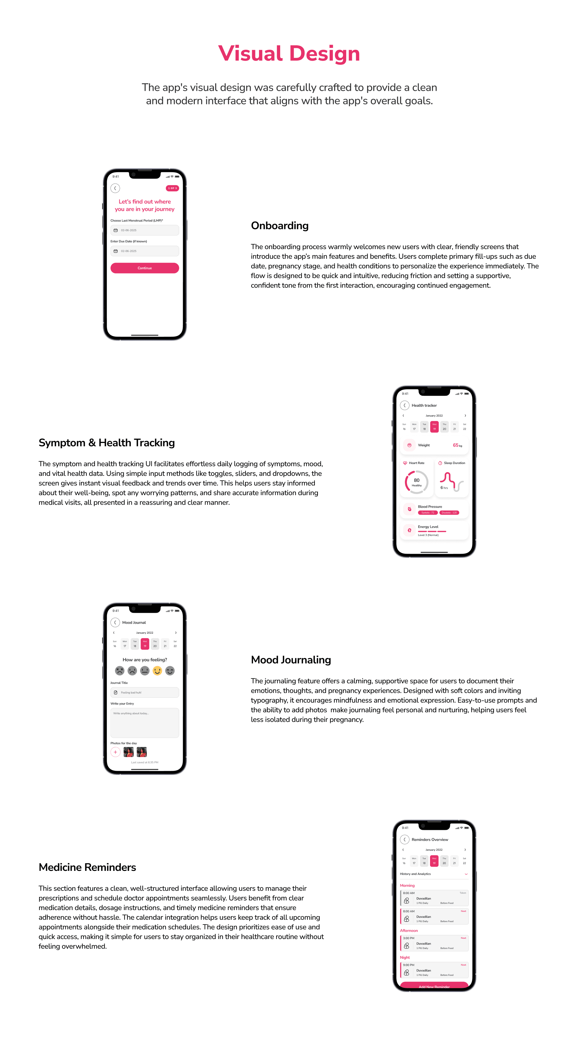 Impact : Designed an end-to-end mobile experience that reduces cognitive load for mothers-to-be by streamlining health tracking and daily routines.